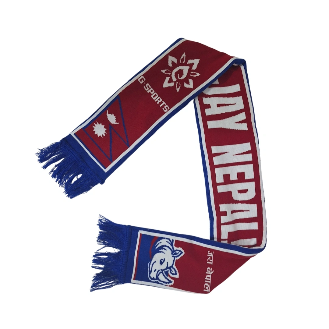 Celebrate your love and pride for Nepal with this vibrant supporter scarf, crafted in the country’s iconic red and blue tones. Measuring 60 inches × 6 inches, it features “JAY NEPAL” in bold lettering along with traditional symbols inspired by the national flag, blending style with heritage. Made from soft, lightweight fabric, the scarf provides warmth while remaining comfortable to wear. Finished with fringed edges and detailed graphics, including a rhino illustration at the bottom symbolizing Nepal’s rich wildlife, this scarf is perfect for cheering at matches, attending cultural events, or simply showing your patriotism.